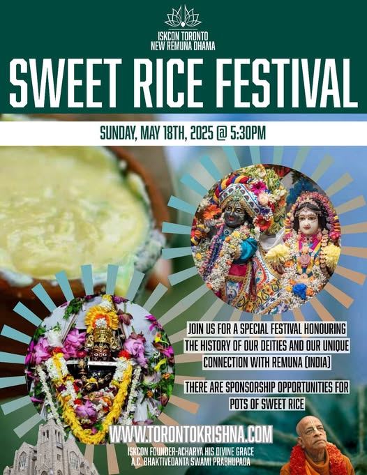 Our beautiful and beloved Deities, Sri Sri Radha Ksira-Chora Gopinatha were named by Srila Prabhupada after a famous Deity of the same name in the beautiful and ancient city of Remuna, India. Ksira means “sweet rice” and chora means “thief”. So, the name “Ksira-Chora” translates into, “one who steals sweet rice”. This famous Deity of Lord Krishna in Remuna was given this name after an incredible incident that occurred hundreds of years ago wherein the Deity actually stole a small pot of sweet rice for his devotee, Madhavendra Puri. To honour this history we annually host our "Sweet Rice Festival", this year we are celebrating on Sunday, May 18th. There are special opportunities to sponsor hand painted pots of sweet rice that have been offer on the altar. To learn more and to sponsor please visit our website - https://torontokrishna.com/2025/05/sweet-riece-festival-may-18th.html (fb)