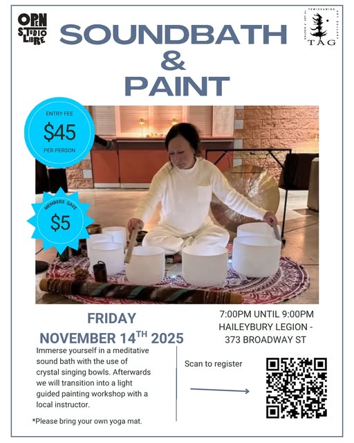 Come have an evening of creativity and relaxation! Friday, November 14 from 7-9pm at the Haileybury Legion - 373 Broadway St Experience a crystal bowl sound bath with Nadine Metson Weston. Create a pour painting led by Sabrina Somersall. No experience necessary! You can purchase tickets online at the link below: https://www.zeffy.com/en-CA/ticketing/paint-n-sip-october--24 --------------------------------------------------------------------------- Venez passer une soirée de créativité et de détente Le vendredi 14 novembre de 19 h à 21 h à la Légion de Haileybury - 373, rue Broadway Faites l'expérience d'un bain de son avec Nadine Metson Weston et ses bols de cristal. Créez une peinture de coulée sous la direction de Sabrina Somersall. Aucune expérience n'est nécessaire ! (fb)