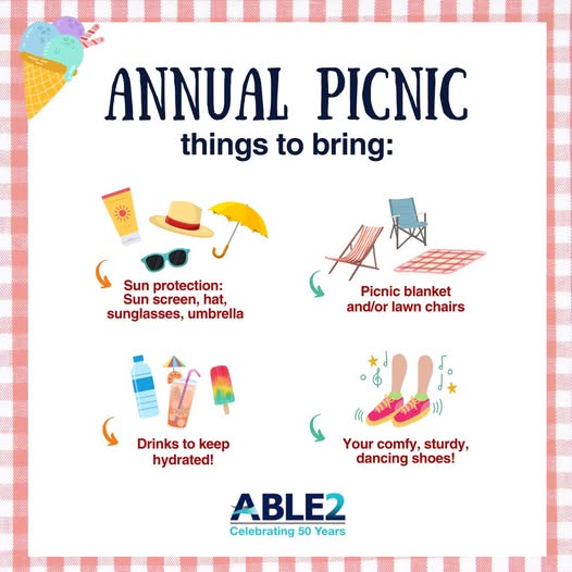 We’re so excited to see you at the Annual Picnic this Saturday! To make the most of the day, don’t forget to bring: 🧴 Sun protection: sunscreen, hats, sunglasses 🪑 Lawn chairs or picnic blankets 👟 Comfy weather-ready footwear 💧 Extra water or preferred drinks 🎉 Your best summer vibes! Let’s make it a day full of sunshine, laughter, and community spirit. See you there! 💙 If you have any questions, please reach out to events@able2.org Thank you to our partner Sequence Marketing! #InclusiveEvents #Ottawa #ABLE2 (fb)
