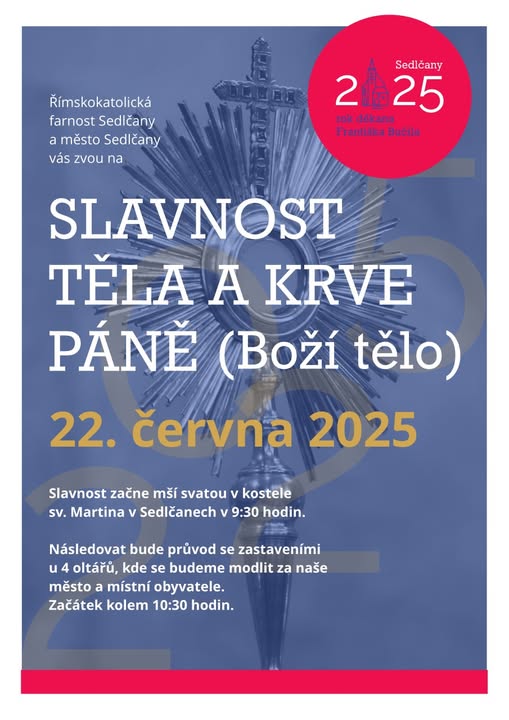 Římskokatolická farnost Sedlčany a město Sedlčany Vás srdečně zvou na slavnost Těla a Krve Páně (lidově Boží Tělo), která začne mší svatou ve farním kostele sv. Martina v Sedlčanech v neděli 22. června od 9:30. Po mši vyjde průvod s Nejsvětější svátostí z kostela do ulic města se zastavením u čtyř oltářů. Průvod se koná proto, abychom si vyprosili Boží požehnání pro naše domovy, ulice, město a celou farnost. V tomto roce věnovaném děkanu Františku Bučilovi tak dojde k obnovení tradice, která se v Sedlčanech pravidelně udržovala právě až do období působení tohoto kněze. (fb)