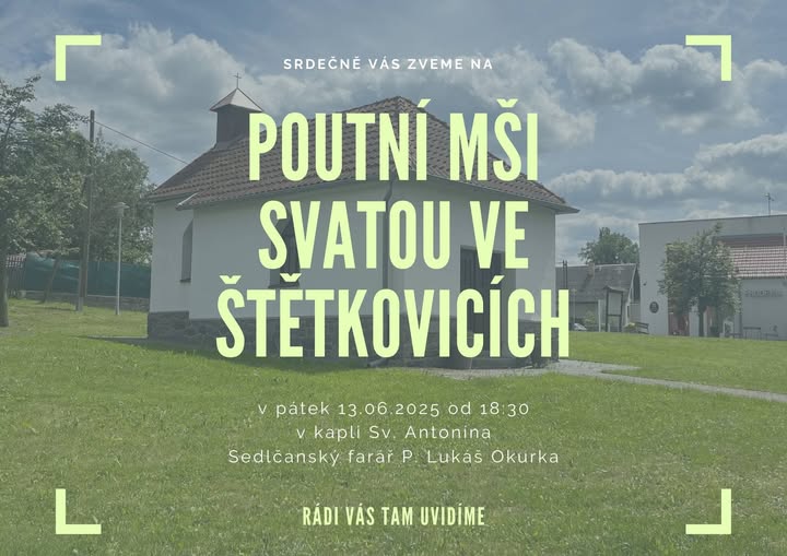 Pan starosta Štětkovic požádal našeho pana faráře o mši svatou k poctě sv. Antonína, jenž mu je obecní kaple zasvěcená. Obec ji letos dokonce na své náklady kvalitně opravila (podlahy atd.). Jste na ni srdečně zváni. Těšíme se na Vás. Autor - Ivanka Čiháková (fb)