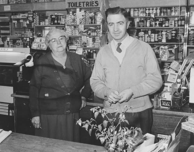 Minnie Way and son Ted Way stand behind the front desk at Way's Grocery Store, c. 1960. #HighRiverHistory #archivalphotooftheday (fb)