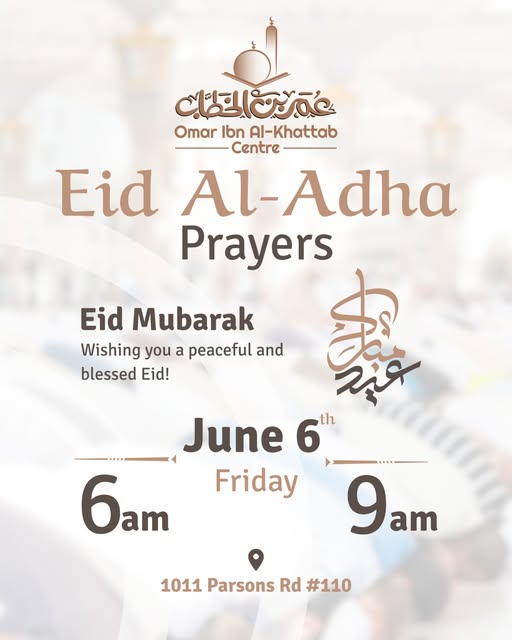 The Day of Arafah is tomorrow, one of the most blessed days of the year! We encourage you to donate in support of Omar Ibn Al-Khattab Centre and help build a vibrant new Islamic school and masjid in South Edmonton. 🎁 Donate here: https://give-can.keela.co/oiac-dhul-hijjah-1446 Eid Al-Adha Prayers, Friday, June 6 - 6 AM | English Khutbah (Ustadh Ahmed) - AM | Arabic Khutbah (Shaikh Ahmed Attia) Join us in prayer and celebration with your family and community! #EidPrayers #DayOfArafah #SupportOIAC #BuildTheFuture #YEGMuslims #Eid2025 (fb)