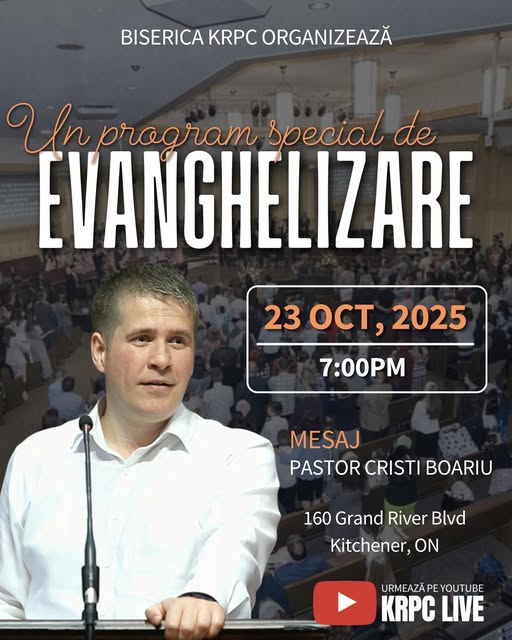 Vă invităm la o seară specială de evanghelizare pe data de octombrie 23, 2025. Vom avea invitat special pe fratele Pastor Cristi Boariu. Programul va începe la ora 7pm. Adresa: 160 Grand River Blvd, Kitchener ON Ora: 7pm Data: 23 Octombrie, 2025 (fb)