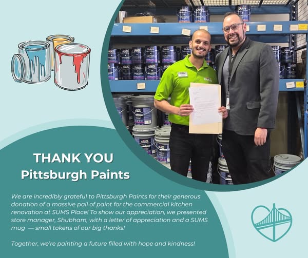 A heartfelt thank you to Pittsburgh Paints and Store Manager, Shubham Chaggar, for their generous paint donation to support the kitchen renovation at SUMS Place. Your support helps us continue building a welcoming and supportive space for our community. We truly appreciate it! 🩷🖌️ #SUMSPlace #CommunitySupport #PaintDonation #KitchenRenovation #LocalBusiness #ThankYou #PittsburghPaints #SupportLocal #CommunityLove (fb)