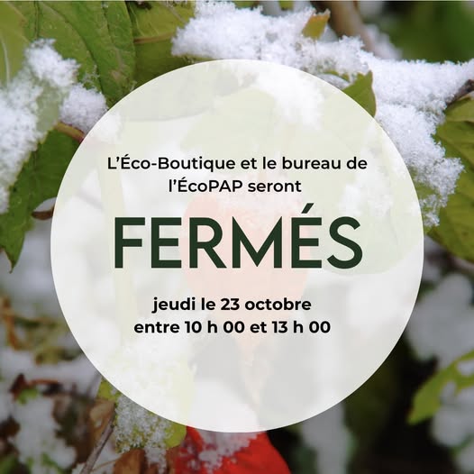 Demain, le jeudi 23 octobre, l'Éco-Boutique et notre bureau fermeront entre 10h00 et 13h00. Passez nous voir en après-midi ! (fb)