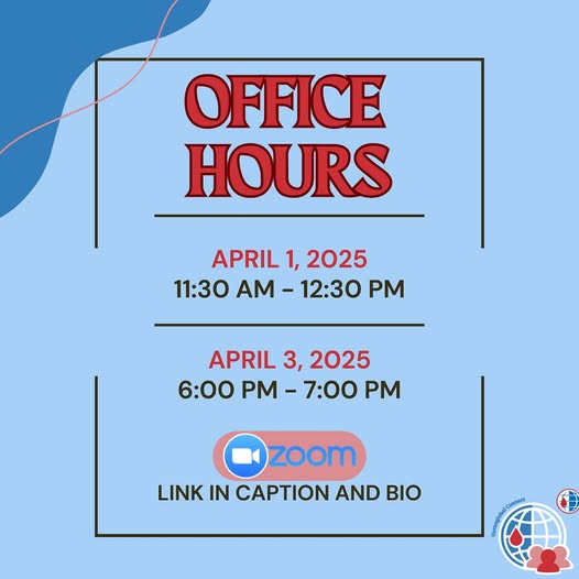 Hello all! We will be hosting online drop-in office hours for you to stop by and ask the Hemoglobal Connect Team questions about ongoing activities, future projects, and anything else you may want to discuss. Zoom link below and in bio. https://us05web.zoom.us/j/4523684008?pwd=gwaQPgb844a8Kdn0CS9KpyaCD0fKtP.1 April 1, 2025 @ 11:30AM - 12:30PM April 3, 2025 @ 6:00PM - 7:00PM (fb)