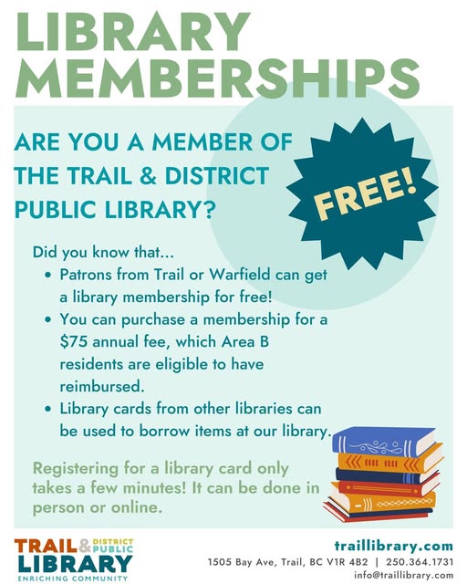 Are you a resident of Trail or Warfield? Come to the Trail & District Library to sign up for a free library membership! Members have access to a wide variety of adult, young adult, and children's books in both print and electronic form. We also have DVDs, board games, audio books, video games, and other fun things like cake pans, a sewing machine and much more! Patrons can also drop-in and try out our in-house use electronics like VR headsets, Nintendo Switch or Xbox! Sign up for a card today and explore everything the library has to offer! Residents of Area B are eligible to purchase a membership with a $75.00 annual fee that can be reimbursed through the RDKB. Members of other libraries can borrow from our library with a maximum of 5 items per card. Registration can be done in person or online at: https://www.traillibrary.com/services/get-a-library-card-online. For more information please call 250-364-1731. #TDPL #enrichingcommunity (fb)