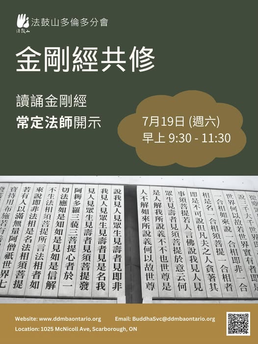 2025年7月19日 上午9:30 – 上午11:30 [EDT] 法鼓山多倫多分會, 1025 McNicoll Ave, Scarborough, ON M1W 3W6, Canada 「以無我、無人、無 眾生、無壽者,修一切善法,卽得阿耨多羅三藐三菩提。」 兩小時的共修包括讀誦金剛經,常定法師開示:運用《金剛經》的智慧,讓生活時時好修行。 https://www.ddmbaontario.org/zh/event-details/the-diamond-sutra-recitation-2025-07-19-09-30 (fb)