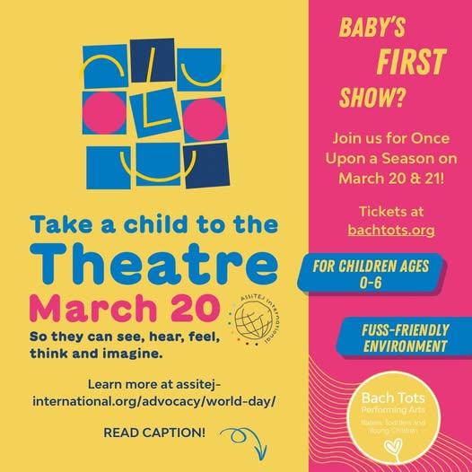 March 20th is Take a Child to the Theatre day and Bach Tots has you covered. Once Upon a Season is a toe tapping romp through the seasons. Dance, storytelling and puppetry for young children and their grown-ups. Tickets on sale now (fb)