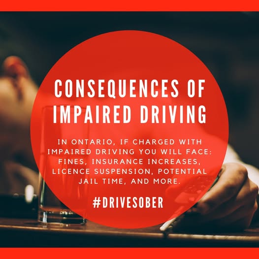 If your weekend plans involve alcohol or cannabis, make sure you plan ahead for a safe and sober ride home. Your plans could include a DD, taking public transit, or calling a taxi or rideshare service. The consequences for driving impaired in Ontario are severe. In Ontario, if you are charged with impaired driving you will face: fines, insurance increases, licence suspension, potential jail time, and more. The risks are real and the consequences are severe. Thanks for making the responsible choice to always drive sober. • • • #ArriveAlive #DriveSober #PartySmart #PlanAhead #RoadSafety #DriveSafe #SafetyTips #StopImpairedDriving #ImpairedIsImpaired #Awareness #DontDriveHigh #DontDriveDrunk #ArriveAliveDriveSober (fb)