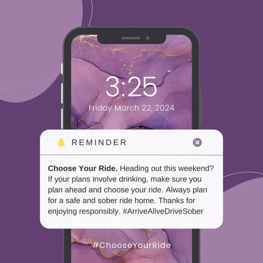 If your weekend plans involve alcohol, make sure to plan ahead and #ChooseYourRide - Your plans could include a DD, taking public transit, or calling a taxi or ride-share service. Thanks for always driving sober! 🚗 • • • #ArriveAlive #DriveSober #PartySmart #PlanAhead #RoadSafety #DriveSafe #StopImpairedDriving #ImpairedIsImpaired #DontDriveHigh #DontDriveDrunk #ArriveAliveDriveSober (fb)