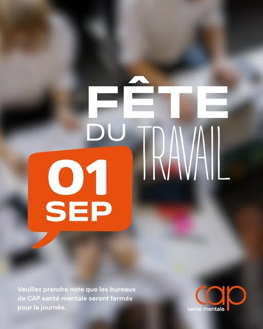 Bonne fête du travail ! Veuillez prendre note que les bureaux de CAP santé mentale seront fermés pour la journée. (fb)