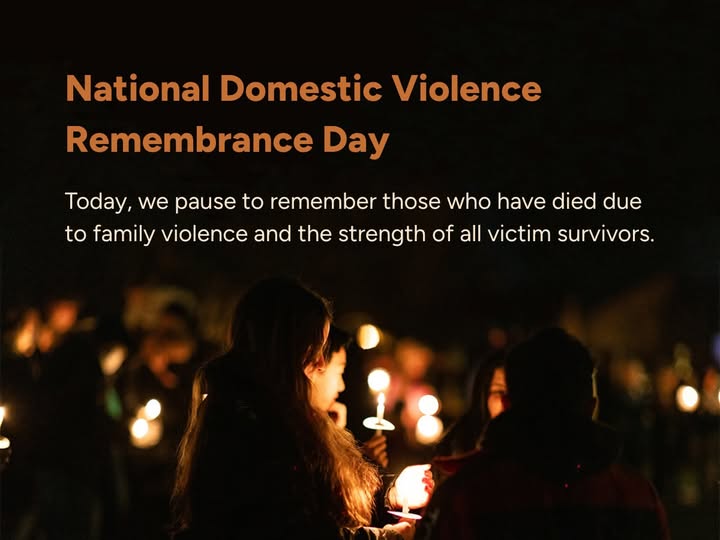 Today, on National Domestic Violence Remembrance Day, we pause to remember those who have died due to family violence and the strength of all victim survivors. So far this year, at least 24 women and seven children have died due to family and gender-based violence. We gather this evening to remember you, to honour you - each of your lives, your futures, your names. You have not been forgotten. Tonight's vigil is a chance for us to come together as a community to mourn those who have died, and find strength and courage together. No one should face family violence alone. #DVRemembranceDay #DFVPM2025 [Image description: White and orange text on dark background with blurred image of people holding candles. Text reads: "National Domestic Violence Remembrance Day Today, we pause to remember those who have died due to family violence and the strength of all victim survivors."] (fb)