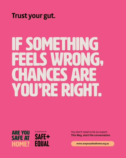 Family violence often happens out of sight, so the signs can be hard to spot. But trust your gut. If something feels wrong, chances are you’re right. Today is #AreYouSafeAtHomeDay. Whilst everyone should feel safe at home every day, this important campaign is a prompt to start a conversation with someone who may be experiencing family violence. Visit www.areyousafeathome.org.au to learn more about the signs of family violence, and what you can do to help. [Image description: black and white text on pink background. Text at the top reads: "Trust your gut." Large text in centre reads: "IF SOMETHING FEELS WRONG, CHANCES ARE YOU'RE RIGHT." Small text at bottom reads: "You don't need to be an expert. This May, start the conversation. www.areyousafeathome.org.au"] (fb)