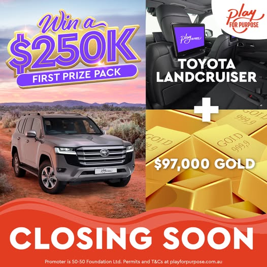 🚨 Only days left! Don’t miss your chance to WIN the $250K First Prize Pack in the Play for Purpose raffle — entries close 8pm (AEST), Thursday 26 June 2025! For just $10 a ticket, you could drive away in a Toyota LandCruiser worth over $152,000 AND score $97,000 in cashable gold bullion 💰🚙 Best of all? Every ticket sold supports Bendigo Health and helps us continue to care for our community. 🎟 Get your ticket now and play for purpose 👉 https://www.bendigohealthfoundation.org.au/help/play-for-purpose (fb)