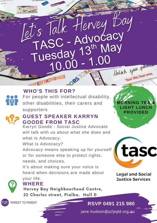 Our Social Justice Advocate Karryn Goode is Guest Speaker at this event in Pialba on Tuesday 13 May, hosted by P2P. Come along and find out how Advocacy can help you! (fb)