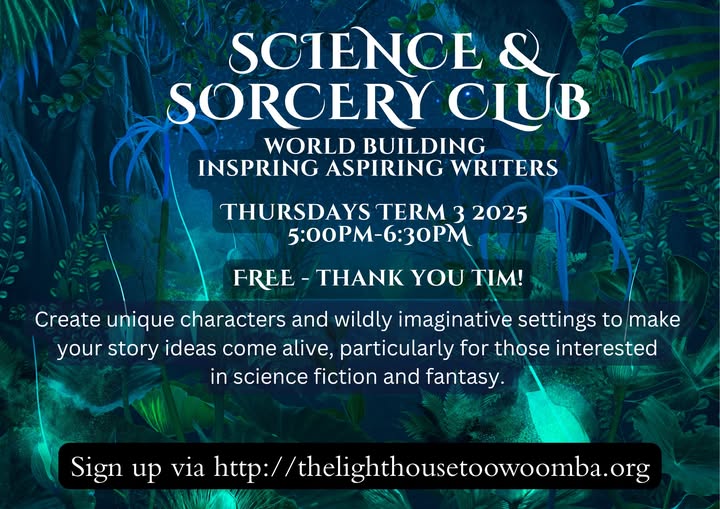 Science and Sorcery Term 3 < Back with Tim Hunter DATE: Thursday 24 July 2025 START: 5:00 pm END: 6:30 pm AGES: AGE Science & Sorcery Club Term 3 2025 with Tim Hunter 'Science + Sorcery Club' For aspiring writers aged approximately 13-17 Create unique characters and wildly imaginative settings to make your story ideas come alive, particularly for those interested in science fiction and fantasy. Learn how to create and evolve your unique characters and wildly imaginative settings to make your story ideas come alive, particularly for those interested in science fiction and fantasy. These genres give us a chance to imagine stories, alternatives, speculate on the impossible, or simply ask: what if? Untangle your ideas to create great backdrops for stories, homes for heroes and villains, or exciting settings for role playing games, like Dungeons & Dragons. Science + Sorcery' Writers Club starts on Thursday 24 July 5:00 to 6:30pm, for 8 weeks (until Thursday 11th September) The cost is FREE - thank you Tim! Sign up via our website :) (fb)