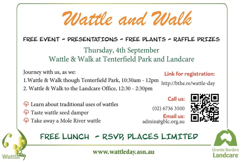 Join us for wattle day this Thursday, 4th September between 10am - 2:30pm. Meet at the Landcare office before 10:15am to car pool to Tenterfield Park, for a plant ID walk with local experts and enthusiasts. We'll go back to the Landcare Office for a relaxing BBQ lunch, where elder Helen Duroux will talk about wattles in traditional uses. She will also provide a yummy wattle seed damper. Please register at: http://bthe.re/wattle-day Or, call the Landcare Office: (02) 6736 3500 (fb)