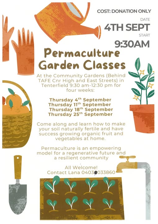 Permaculture Gardening course - 3 more weeks (of 4) through September at the Tenterfield TAFE/ Tenterfield Community Garden, corner of High and East Street (East street side). Gold coin donation - contact Lana Tyacke: 0403 033 860. More details in flyer below - don't miss out on this fantastic opportunity to learn from one of our most experienced and passionate practitioners and instructors! (fb)
