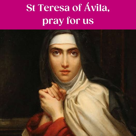 Today we joyfully celebrate the feast of St Teresa of Ávila, the first female Doctor of the Church. Born in Ávila, Spain, in 1515, Teresa grew up with a deep desire to know and love God, though her early years were marked by struggle and distraction. After losing her mother at age 11, she sought solace in prayer and the saints’ example. Yet it was not until she entered the Carmelite convent in Ávila at 16 that her soul began to fall completely in love with God. Teresa endured years of physical suffering and spiritual dryness but through perseverance and prayer she was transformed by divine grace. Her heart was set ablaze with a renewed zeal for holiness which led her to a profound conversion. Moved by the Holy Spirit and inspired by St John of the Cross, she reformed the Carmelite Order, founding the Discalced Carmelites, a community devoted to poverty, silence and contemplative prayer. Through her writings, she continues to guide countless souls toward the intimate friendship God offers in prayer. St Teresa reminds us that prayer is nothing less than a close sharing between friends. Her symbols are the heart, the arrow and the book, which are signs of her ardent love, suffering and wisdom. She is the patron saint of religious orders, those who suffer from illness or headaches and all who seek to grow in prayer. St Teresa of Ávila, pray for us. 🙏💘📚 (fb)