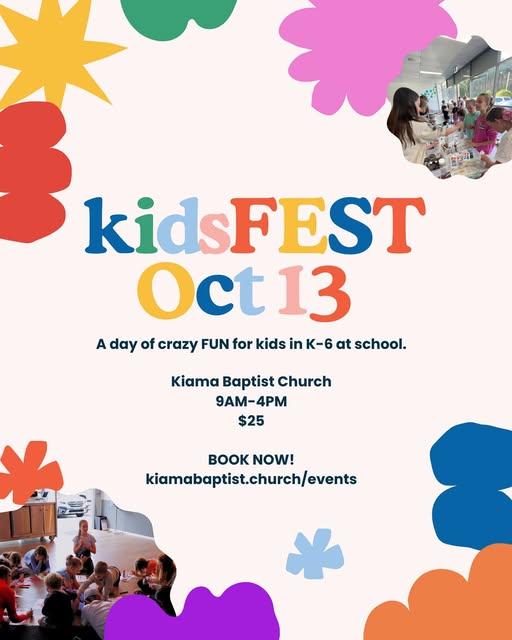 🎈kidsFEST October 13th🎈 On October 13th (School Staff Development Day), kids in Kinder–Yr6 are invited for a full day of fun 🎉 Games | 🎶 Songs | 📖 Bible Time | 🎨 Activities | 🍔 Food | 🔫 Laser Tag @Revolution Laser! 📅 October 13th, 2025 (Staff Development Day) 🕘 9am–4pm 📍 Kiama Baptist, 1/3 Brown St, Kiama 💲 $25/child 👉 Register now: www.kiamabaptist.church/events (fb)