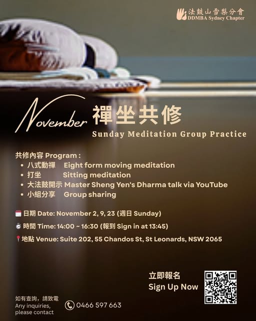 🧘♀️ 週日下午 · 禪坐共修邀請 🧘♂️ 「心中不存得失想,常作世間無事人。」── 聖嚴師父 如何體會這句話呢? 不妨從 #禪修 開始,練習安穩自己的心 🌿。 📅 11月2日、9日、23日 下午 14:00-16:30 👉 立即報名:https://forms.gle/VuV6uMGz2ADT8QYX8 📍 共修地點:Suite 202, 55 Chandos St., St Leonards, NSW 2065 📞 如有咨詢,請聯絡 0466 597 663 🙏 歡迎隨喜護持道場,共沐法喜 🙏 歡迎一同參與,體驗靜坐的力量,讓自己在繁忙生活中找到片刻安定。 #禪修 #法鼓山雪梨分會 #聖嚴師父 #靜心安定 #chanmediation (fb)