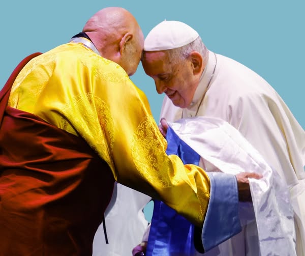 WE EXTEND OUR CONDOLENCES ON THE DEATH OF HIS HOLINESS POPE FRANCIS We extend our deepest condolences on the passing of His Holiness Pope Francis on Easter Monday. His life of service and commitment to humanity will be remembered. We also extend our heartfelt condolences to all Catholics around the world in this time of mourning. Photo credit: Lola Gomes. Design: FPMTA Pope Francis receives a scarf as a gift from Choijiljav Dambajav, abbot of the Buddhists' Zuun Khuree Dashichoiling Monastery in Ulaanbaatar, Mongolia, during an ecumenical and interreligious meeting at the city's Hun Theatre Sept. 3, 2023. (fb)