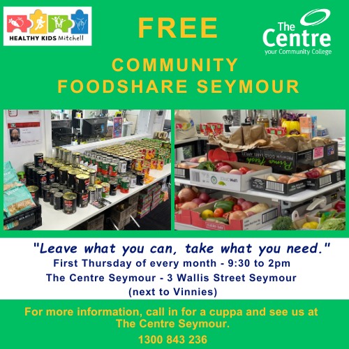 FREE Community Foodshare – Seymour Today’s the day! Come along to The Centre Seymour (3 Wallis Street, next to Vinnies) for our Community Foodshare. 🕘 Time: 9:30 AM – 2:00 PM 📍 Location: The Centre Seymour “Leave what you can, take what you need.” Fresh produce, pantry staples, and a welcoming space for everyone. Pop in for a cuppa and say hello! For more info: www.thecentre.vic.edu.au or call 1300 843 236. (fb)