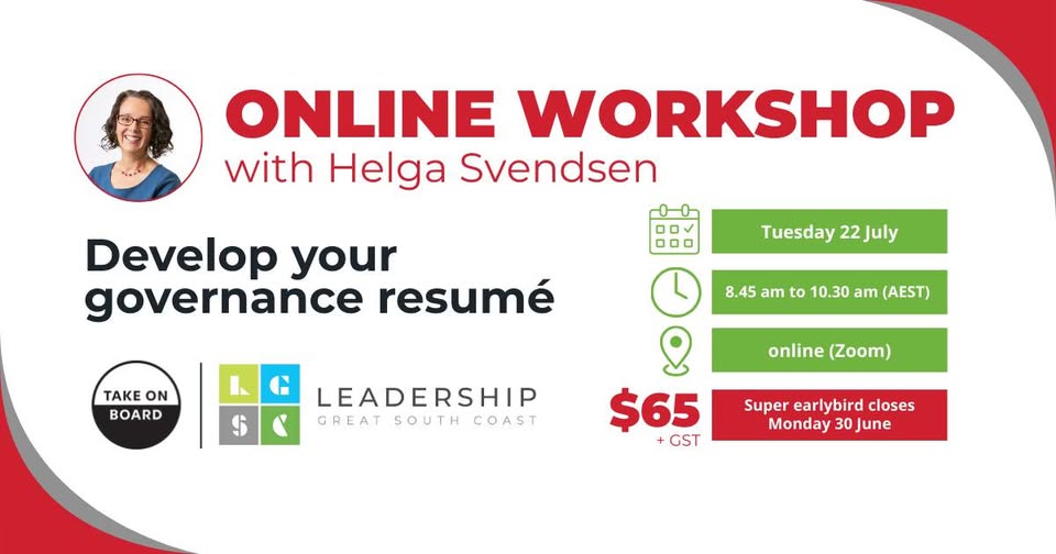 Don't miss out! The super early bird rate ($65+GST*) closes Monday, 30 June. Register here to join Helga Svendsen to Develop your Governance Resume: https://helgasvendsen.com.au/.../develop-your-governance.../ You will gain: ✅ Expert insights to showcase your governance strengths ✅ Actionable strategies for a resume that gets noticed ✅ The confidence to stand out in a competitive landscape #governance #workshop #greatsouthcoast #community Helga Svendsen (fb)