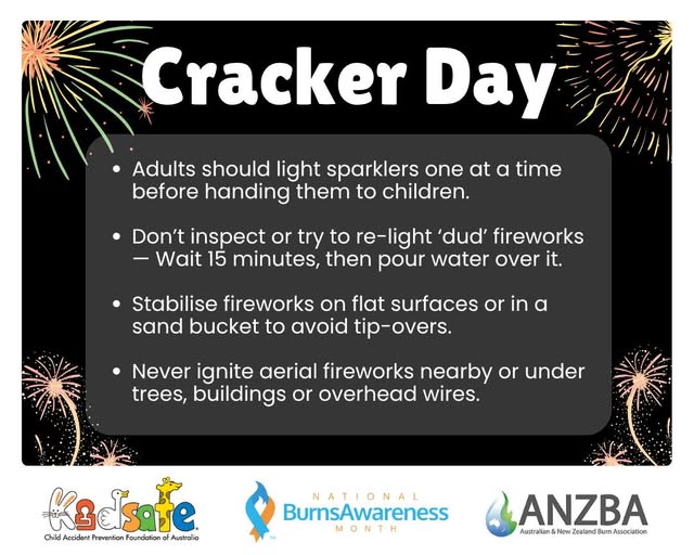Celebrate Territory Day the Safe Way! Children should not have access to fireworks and should always be supervised in areas where fireworks might be. Remember, if you are purchasing fireworks, only buy them from a licensed retailer. If a burn injury occurs, remember that cool running water for 20 minutes is the best treatment. If you’re concerned about a burn injury, it's always safer to get it checked out by medical professionals. #NBAM2025 #RemoveCoolCoverSeek ANZBA (fb)
