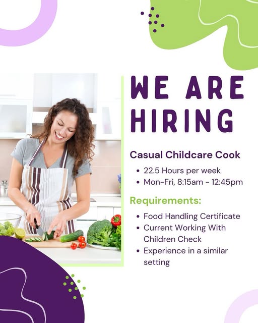 👩🍳 URGENT HIRE – Casual Childcare Cook Needed! 🍎 Charlestown Childcare & Early Learning Centre We’re urgently seeking a caring and capable Casual Cook to join our small, community-based childcare team in Charlestown. If you love cooking and creating nutritious meals for little ones – we need you! 🕒 Hours: Monday to Friday, 8:15am – 12:45pm (22.5 hrs/week) 📆 Immediate start preferred – we’re happy to consider applicants who are available fewer days per week. ✅ Requirements: Food Handling Certificate Current Working With Children Check Experience in a similar childcare or kitchen setting Experience catering for food allergies We’re a not-for-profit, 40-place centre with a warm, family-like atmosphere and a supportive team of long-term staff. Your role will be vital in providing healthy, home-style meals that help fuel growing minds and bodies. 📍Located in Charlestown 📧 Apply now! Contact us on 02 4943 7099 or admin@charlestownchildcare.com.au #NowHiring #CharlestownJobs #ChildcareCook #EarlyLearningCentre #CommunityChildcare (fb)