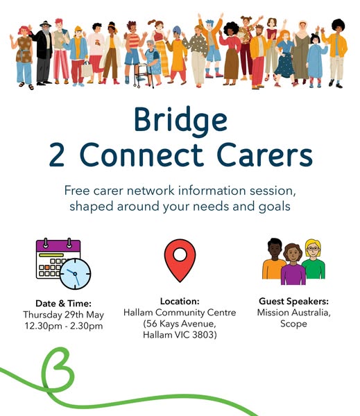 Join us at the next Bridge 2 Connect Carers Support Group 💚 This free carer network information session is your gateway to connecting with fellow carers and discovering valuable resources. This session we will be joined by speakers from Mission Australia and Scope. Discover essential insights on housing options for people with disabilities and learn how to apply with Scope's expert guidance. Plus, explore employment opportunities for carers and individuals with disabilities with Mission Australia's valuable advice. Thanks to a generous grant from Carers Victoria, funded by the Victorian Government's Connecting Carers in their Community Small Grant Program, we're excited to be running this empowering initiative. Event Details: 🔷 Date: Thursday 29th May 🔷 Time: 12.30pm - 2.30pm 🔷 Location: Hallam Community Centre (56 Kays Avenue, Hallam VIC 3803) Interested in being part of this next session? We’d love to welcome you! RSVP your attendance below: Karen Matthews ✉️ kmatthewspcq@thebridgeinc.org.au 📞 03 8710 8519 Click the link below for Dari, Turkish, Punjabi & Thai translation: https://hubs.li/Q03mq6fG0 #Bridge2ConnectCarers #CarersVictoria #Scope #MissionAustralia #CarersSuportGroup #NetworkingOpportunity #TheBridgeInc (fb)