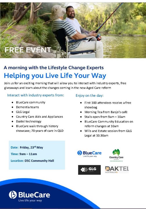 Information session presented by Blue Care at DSC on Friday 23rd MAY. Free Event. All Welcome (fb)