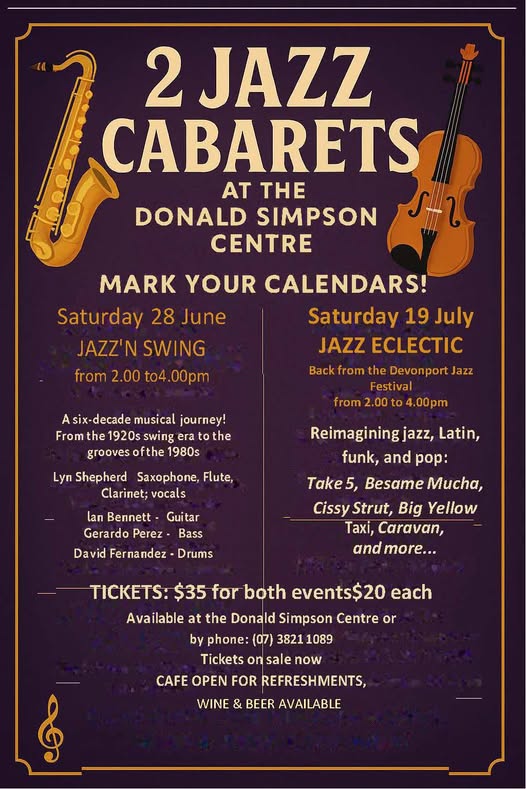 Coming to the DSC in June and July. Two Jazz Cabarets. Jazz tunes that we used to see and hear in MGM musicals, hit parades, top 40s and the like over the years. If you enjoy listening to good music in the jazz genre, two bands are playing on Saturday afternoons at the Donald Simpson Community Centre in Cleveland. Book you tickets at the DSC or by phone on 3821 1089 and treat yourself, family and friends to an enjoyable music afternoon or two. Details available in the flyer below. (fb)