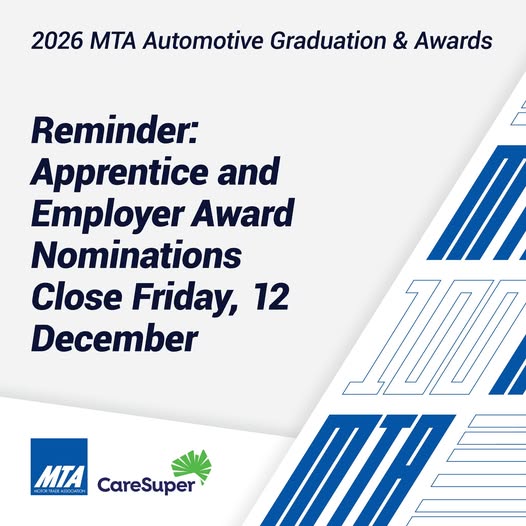 There’s still time to submit your nominations for the 2026 MTA Automotive Graduation & Awards Event! Don’t miss your chance to recognise the apprentices shaping the future of our industry - and the employers who help them succeed! 🎓🎉 Apprentice categories include the Bob Goldsworthy Award, Most Outstanding 1st, 2nd, 3rd, or 4th Year Apprentice, Female Apprentice of the Year, Most Outstanding School-Based Apprentice of the Year, Dual Trade Apprentice of the Year and Apprentice of the Year. You can also nominate an employer for the Industry Employer of the Year Award! ⏳ Apprentice and employer nominations close 11 pm ACDT, Friday 12 December 2025. 👉 Nominate your apprentice or employer here: https://qrco.de/bgQ22p (fb)