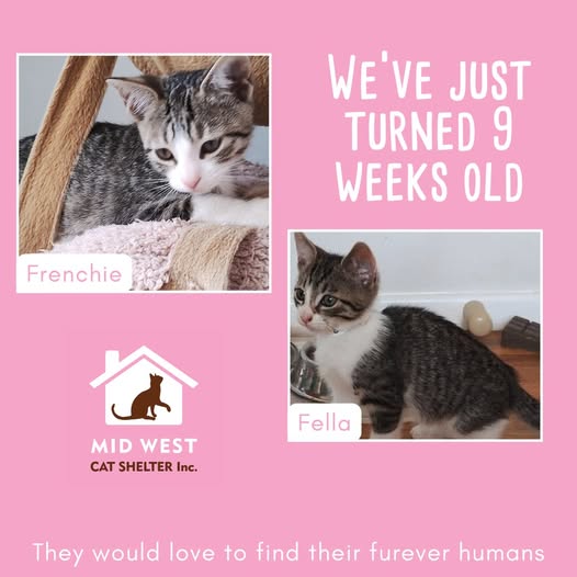 🐱🐱Meet the F Kittens! 🐱🐱 These darlings have just turned 9 weeks old are almost ready for meet and greets! Frenchie (F) is a little more shy than Fella (M) but doesnt take long to warm up to you. They love to play and purrpurrpurr! 📱 Please call 0487 193 244 to set up a meet and greet. Mid West Cat Shelter Inc. cats are: 🌟 Sterilised (or with a prepaid voucher) 🌟 Microchipped 🌟 Health checked 🌟 Flea & worm treated 🌟 And have received at least their first F3 vaccination. Adoption Fees: ✨ Kittens $275 ✨ Adults 6 months to 5 years $215 ✨ Mature Adults 6 years to 9 years $175, ✨ Senior Adults 10+ years $100 *Cats adopted through our friends at Petbarn are subject to instore pricing. This adoption fee is fantastic value for everything that’s included and couldn’t be done without the wonderful support of our friends at Sanford Veterinary Clinic! Male kittens receive a sterilisation voucher if under 6 months old. Female kittens can be adopted as soon as they are advertised, But cannot leave MWCS care until after they have been sterilised at around 16 weeks of age. Adults are sterilised upon coming into care. http://midwestcatshelter.com/available-cats-and-kittens/ #midwestcatshelterinc #fostercats #adoptdontshop #adopt #rescue #rescuecatsofinstagram #rescuecats #rescuecat #geraldton #fostercatsofinstagram (fb)