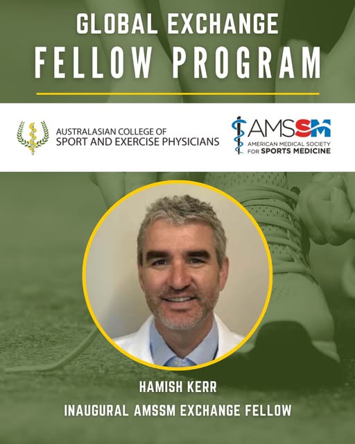 We look forward to welcoming Dr Hamish Kerr, the recently announced inaugural AMSSM travelling Fellow, to our upcoming ACSEP Annual Scientific Conference in November. Dr Kerr joins us as part of an exciting new partnership for ongoing exchange between the American Medical Society for Sports Medicine (AMSSM) and ACSEP. In alternate years, from 2026 onwards, ACSEP will send a Fellow over to the USA to join the American Conference, starting with the 2026 AMSSM Conference in Seattle. (fb)