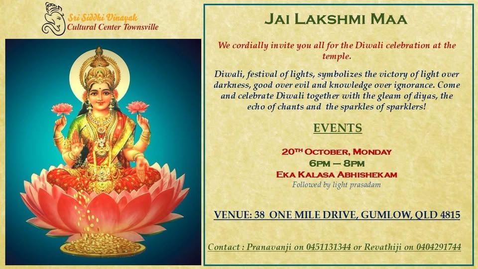 "Jai Lakshmi Maa 🙏✨ Join us for Diwali celebrations at Sri Siddhi Vinayak Cultural Center Townsville! 🕯️ Eka Kalasa Abhishekam on Oct 20 (Mon), 6-8 PM 📍 38 One Mile Drive, Gumlow QLD 4815 Contact: Pranavanji (0451131344) or Revathiji (0404291744) Celebrate Diwali with diyas, chants & sparklers! ✨" (fb)