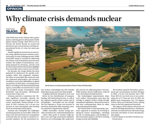 Our first article of 2025 was published in @thecanberratimes exploring the need for #nuclearenergy to combat the #climate crisis. The WMO 2024 update paints a grim picture: 2015–2024 is the hottest decade on record, and #globalemissions continue to rise. While #renewables are essential, their intermittency and the growing demand for #electricity show that they alone cannot solve our energy needs. https://www.canberratimes.com.au/story/8857564/ #Nuclearenergy, however, offers a proven solution with consistent, low-carbon baseload power. Countries like #France, #Ontario, the #US and the #UAE have already demonstrated its potential to reduce emissions significantly. We must overcome ideological divides and prioritise pragmatic, inclusive energy solutions. Our window to tackle climate change is closing fast, and nuclear must be part of the mix to ensure #energysecurity and meet our decarbonisation goals. Let’s start the year with a pragmatic approach from the current government and LIFT THE BAN on nuclear in Australia. (fb)