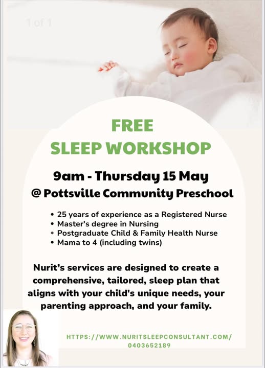 We are delighted to be hosting a FREE SLEEP WORKSHOP with a qualified sleep consultant. Nurit will run a workshop where you are welcome to come and ask any questions you may have about helping your child with sleep. Her expertise runs from babies to school aged children. Bring a friend - members of the wider community are warmly welcome. WHERE: Pottsville Community Preschool. 2-4 Centennial Dr, Pottsville. WHEN: Thursday 15th 2025 TIME: 9am (fb)