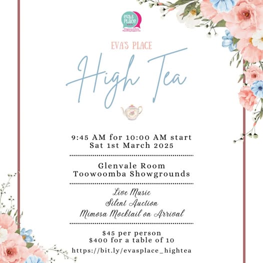 Book through the link in the bio 🌸 Join us on Saturday, March 1st, 2025, for a relaxed and flavour-filled morning at Eva’s Place High Tea Fundraiser. From 9:45 AM, enjoy a refreshing mocktail on arrival before sipping your favourite brew from your fanciest teacup (please bring your own) and savouring delicious treats. Hear inspiring stories about the work of Eva's Place, supporting women in our city through crisis and challenging pregnancy situations, and discover how you can make a difference. Bid on incredible silent auction items, including art, holidays, and hampers, with all proceeds directly benefiting the cause. Tickets are available now with discounts for booking a table of ten. Follow the event on Eva's Place Facebook for updates. We can’t wait to spend the first day of autumn with you in Glenvale! (fb)