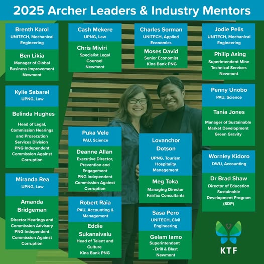 2025 Archer Leaders matched with mentors from leading organisations in PNG and Australia! Once again, we are incredibly grateful to have industry leaders raise their hands to mentor this year's cohort of Archer Leaders. 🦋 With Archers from a wide range of disciplines, we have also paired mentors from equally diverse industries, including senior leaders from Newmont Australia, Kina Bank, Fairfax Consultants, Green Gravity, PNG Sustainable Development Program Ltd. and the Independent Commission Against Corruption. These experienced professionals will support the Archer Leaders through their year-long experiential leadership journey. They will share their knowledge and expertise, offering guidance and coaching to help develop Archers' skills, confidence, and networks in their chosen field. Stay tuned for more Archer Leader news! The Archer Leadership Development Program is supported by Newmont Corporation , @Kina Bank and the Fred P Archer Trust managed via Perpetual TrusteesPNG Sustainable Development Program Ltd. (fb)