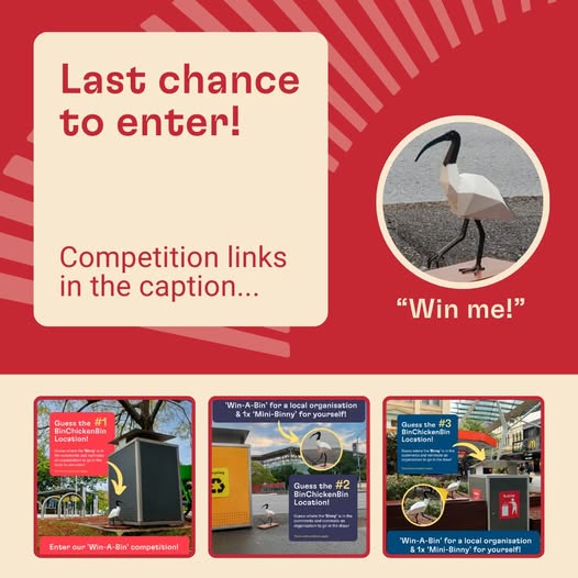 📣 Entries close tomorrow – so don’t miss your chance! One lucky entry will be drawn at random, with the winning organisation receiving their very own Help-manufactured Bin, and the nominating person taking home the Mini-Binny, the custom statue handmade by Sethius Art. 👉 Get up to 5 total entries by participating in our 'Guess the Location series' (linked below): ✅ Drop your guess on any of our 3 “Guess the Location” posts. ✅ Nominate your chosen organisation in your comment. ✅ Make sure you’re following us! - Guess the location #1: https://www.facebook.com/share/p/1LVk77jBwi/ - Guess the location #2: https://www.facebook.com/share/p/164LcMJ24r/ - Guess the location #3: https://www.facebook.com/share/p/1B9nWQkgEw/ The winner will be announced by close of business on 19 September. Don’t miss out! Terms and conditions apply - see website for details: https://www.help.org.au/brisbanes-bin-chicken-bin/ #WinABin #BinChickenBin #SocialEnterprise (fb)