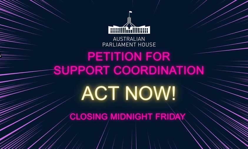 The time to act is now: https://www.aph.gov.au/e-petitions/petition/EN7619 Without enough signatures, the petition to protect Support Coordination will lapse without consideration. This is an incredibly unique opportunity to make sure the voices of Support Coordinators, providers, participants, and families are heard at the federal level. ⭐️ Thank you to those who have shared these posts ⭐️ We applaud those who have emailed out the petition links to their Participants and families ⭐️ We are grateful to all who have requested the support of their provider networks to get behind us Together, let’s push this over the line before midnight Friday (fb)
