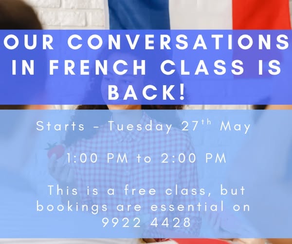 Bonjour! Do you want to practice speaking French? Join our FREE Conversations in French Class with our new teacher Patricia, every Tuesday from 1 pm till 2 pm. This class starts on Tuesday 27th May. Bookings are essential on 9922 4428. See you there! #kirribillineighbourhoodcentre #conversationsinfrench #frenchclass #Kirribilli (fb)