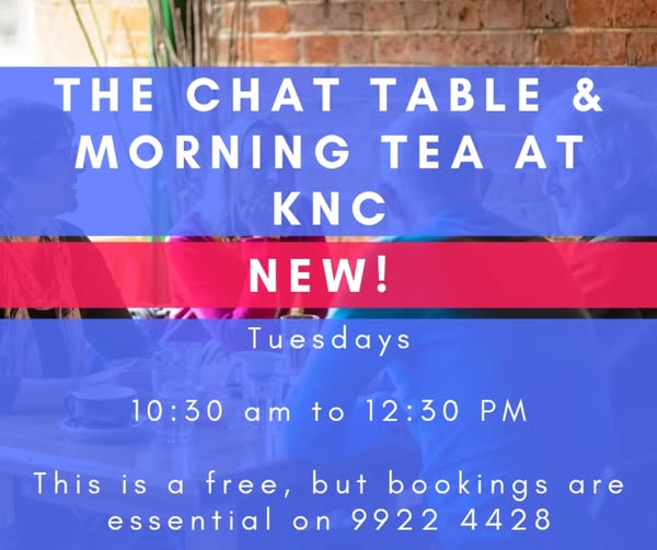 NEW The Chat Table & Morning tea Held each Tuesday at 10.30am – 12.30pm, here at KNC on our upstairs balcony (a beautiful area which is also heated and covered in winter). We encourage residents of Kirribilli and lower north shore to sit and have a chat, make new friends, and connect. Our wonderful facilitator is Pamela Caldecoat. A lovely local who is looking forward to meeting with everyone. FREE and bookings essential on 9922 4428 #kirribillineighbourhoodcentre #community #connect #lowernorthshore #kirribilli (fb)