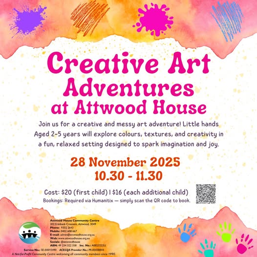 Join us at Attwood House on Friday 28 November 2025 for a morning full of colour, creativity, and sensory fun! Little hands will dive into paint, textures, and imagination designed to spark joy and creativity. ✨ 💰 $20 per first child | $16 for each additional child ⏰ 10.30am - 11.30am 📲 Bookings essential via Humanitix: https://events.humanitix.com/creative-art-adventures-ah 👩👧 Parents and carers are required to stay and enjoy watching their little ones’ creations come to life! Don’t miss out — it’s going to be a wonderfully messy and magical morning! 💛 (fb)