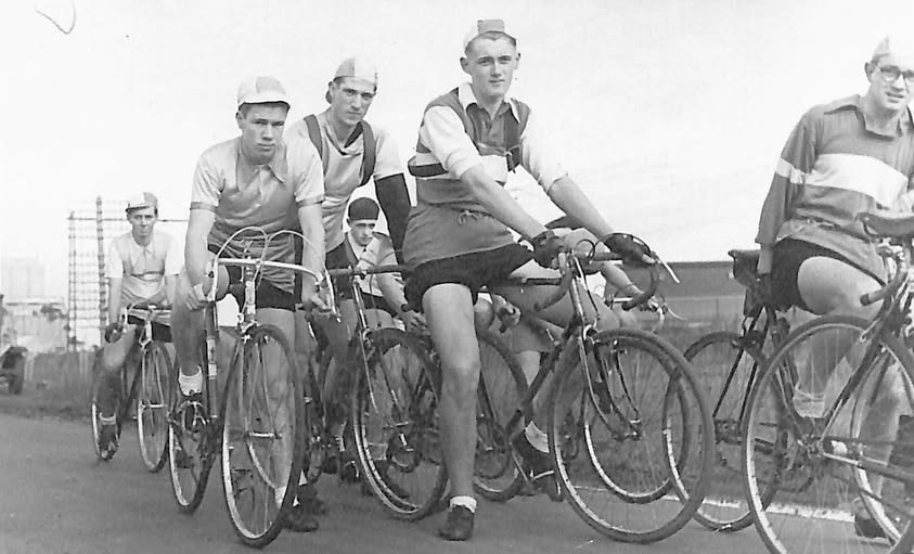 Sunshine Amateur Cycling Club 10th June 1950 Start of 30 mile race Albion, Sydenham, Melton and back along Ballarat Road. R - L Keith Alle, Leon K Leeberger, Peter Ingram, Murray Elmer (Riders at rear unknown) The start and finishing lines for many of the club's races were in Adelaide Street opposite the State School south of Ballarat Road Photo by Ron Iliff (fb)