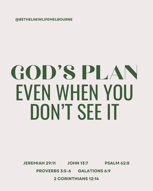 We hear it all the time: “Trust God’s plan.” But when life feels uncertain, that’s easier said than done. . 📖 “For I know the plans I have for you,” declares the Lord... —Jeremiah 29:11 This isn’t just a feel-good verse—it’s a promise. God’s not winging it. He knows exactly what He’s doing, even when we don’t. . Even the disciples didn’t always understand what Jesus was doing. 📖 Jesus replied, “You do not realize now what I am doing, but later you will understand.” —John 13:7 God doesn’t expect us to have it all figured out—He just wants us to trust that He does. . God isn’t just after what you can do for Him—He’s after you. 📖 “I do not seek yours, but you.” —2 Corinthians 12:14 He wants your honesty, your time, your attention. He wants relationship—not just requests. . So why do we still worry after we pray? If we say we trust God but still carry the weight, maybe we need a heart check. Not to feel bad—but to go deeper in faith. . How Do We Trust God More? 1. Be Honest – Tell God how you really feel. He can handle your doubt. (Psalm 62:8) 2. Stay Rooted in Truth – Let His Word guide your heart, not just your emotions. (Proverbs 3:5–6) 3. Keep Moving – Even small steps in faith matter. (Galatians 6:9) You may not understand what God’s doing right now—but you will. Trust His timing. Trust His heart. And don’t just seek what’s in His hand—seek His face. . #trust #faith #waitingseason #encouragement #plan #purpose #promise #bethelnewlifemelbourne #stepintostepup #church #dandenong #melbourne #Australia #wordoftheday #bnlcf #bethelnewlife #bethelnewlife7 #bethelnewlifeministries (fb)